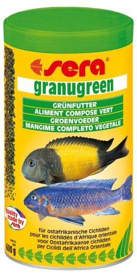 Durch den hohen Anteil pflanzlicher Rohstoffe ist dieses Granulatfutter besonders für überwiegend Pflanzen fressende Cichliden (z. B. Cichliden des Malawi- und Tanganjika-Sees) geeignet. Das Futter enthält über 7 % leicht verdauliche Weizenkeime sowie Spirulina-Algen zur Förderung der natürlichen Farbenpracht. In Kombination mit granured stellt granugreen für omnivore (Alles fressende) Arten eine ausgewogene Ernährung dar. Neuimporte lassen sich problemlos auf das Futter umstellen. Es ist formstabil und bleibt so auch nach dem Absinken attraktiv.